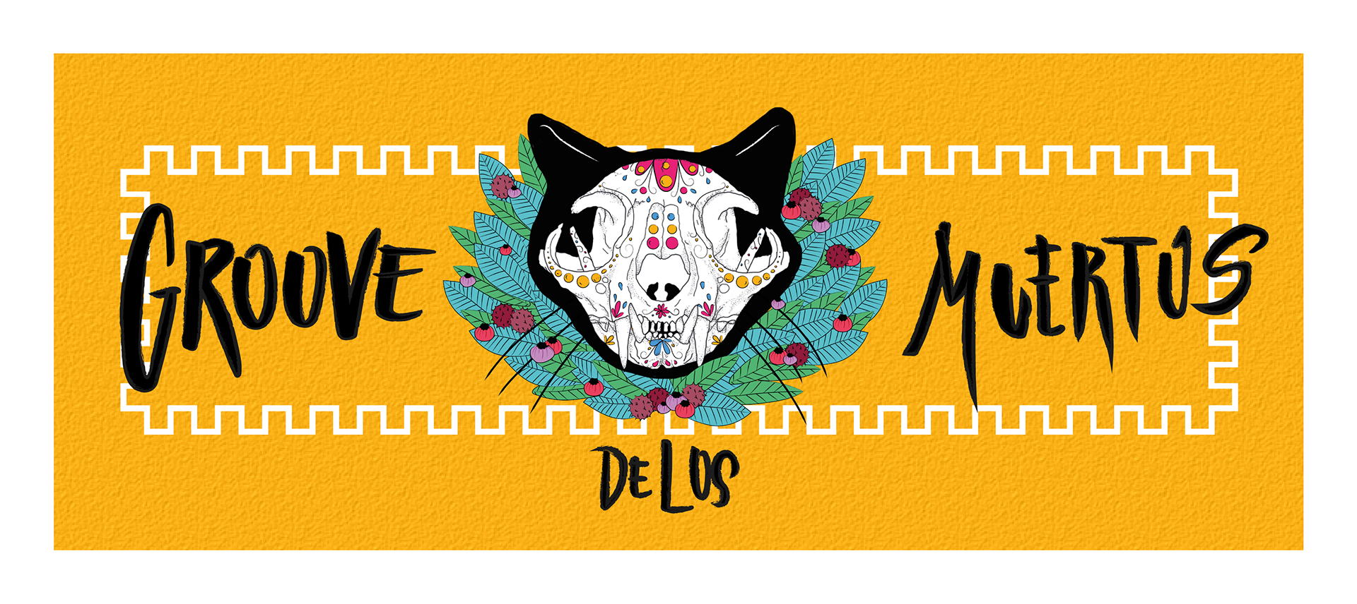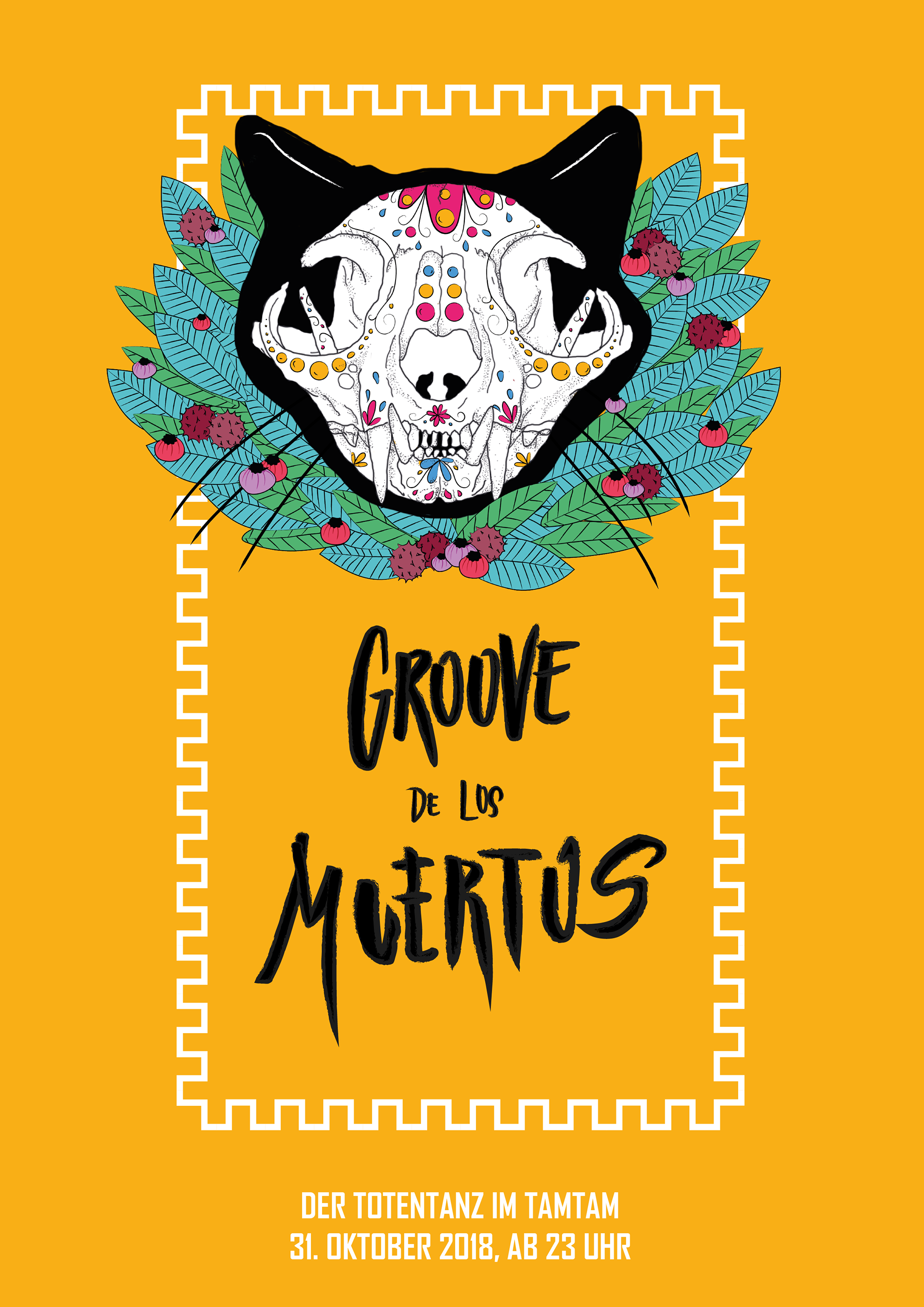Illustration and graphic design for a DJ´s Halloween party. Based on the Dia de los Muertos designs - with a cat. Because cats always work.